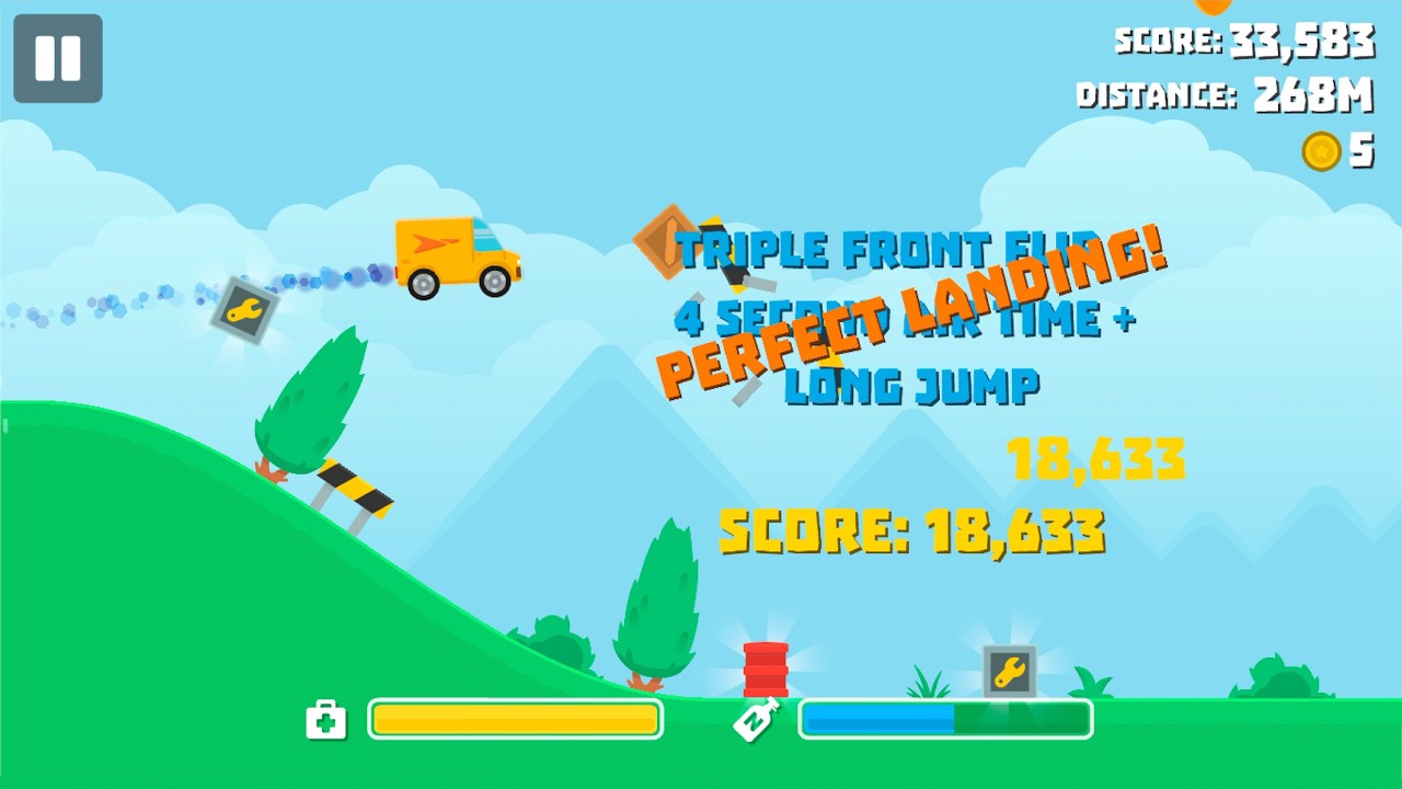 Car Stunt Mania is a 2D physics-based arcade stunt racer. You drive across endlessly generated terrain, launch off hills, chain flips and combos mid-air, and try to travel as far as possible without blowing up.