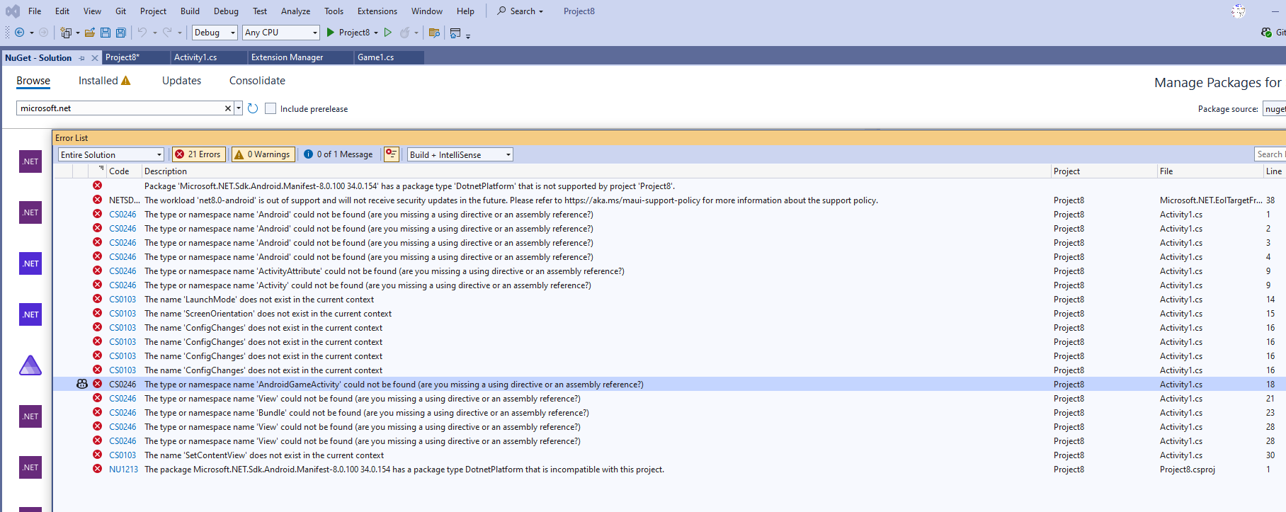 I currently get the below errors during build. (Ive used monogame framework android as the template, as I couldnt work out how to convert my project to android format). I think Im missing packages and extensions. Would someone please assist by letting me know what is missing based on the below errors. Thanks, John U
